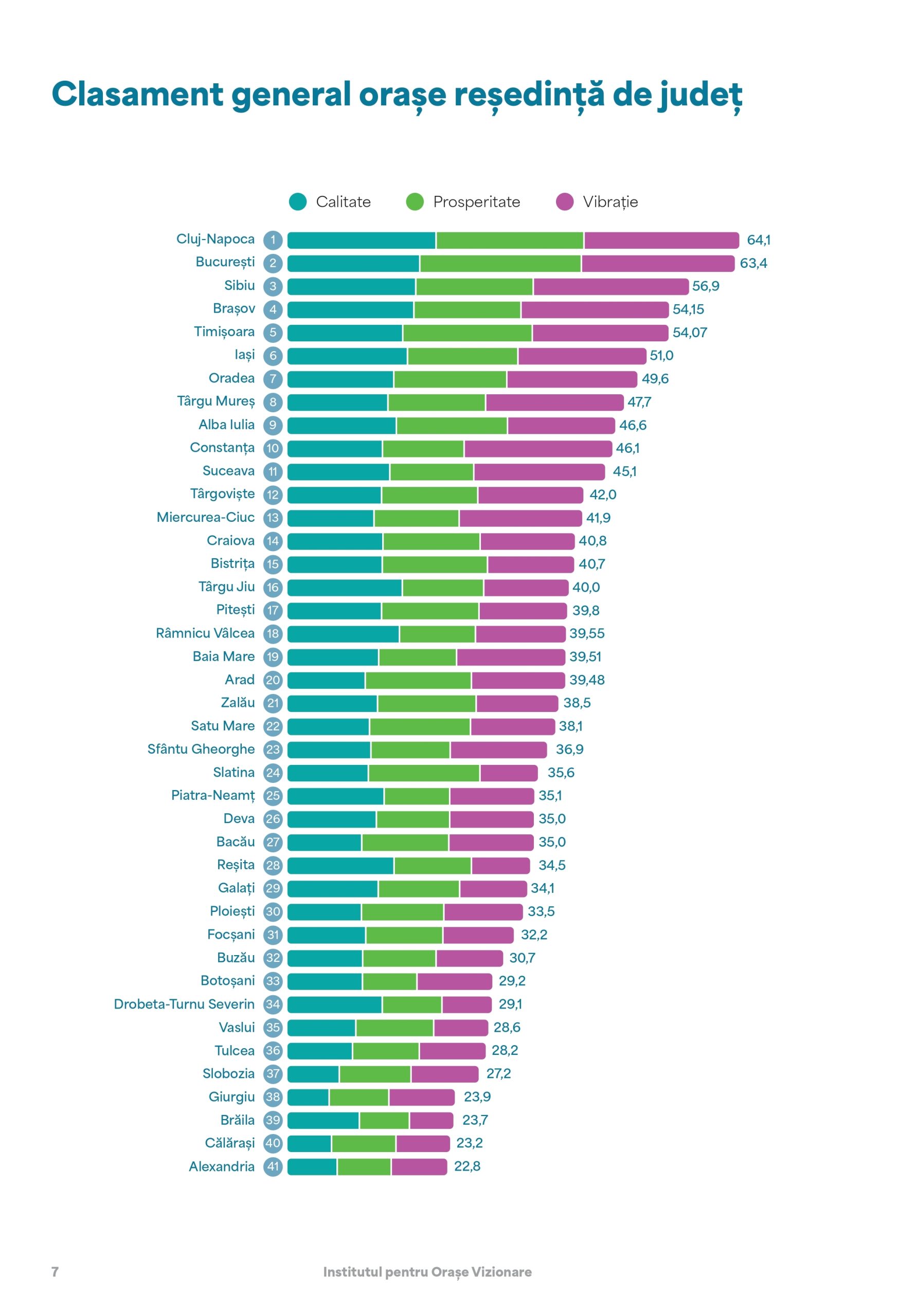 Institutul pentru Orașe Vizionare, un ONG din București ce are la bază o echipă complexă de consultanți de strategie, research, place branding și comunicare, a dat recent publicității „Indexul de Performanță al Orașelor” pe 2024 în urma unei cercetări solide și pluridisiciplinare realizată în ultimii doi ani. „City Index” este un instrument de măsurare a progresului și a performanței urbane dezvoltat de IOV care a analizat cele 41 de municipii reședință de județ din România pe baza a 3 componente ale performanței – CALITATE, PROSPERITATE, VIBRAȚIE – împărțite pe 13 domenii cu 51 de indicatori provenind din peste 20 surse de date diferite, de la surse oficiale la platforme online.