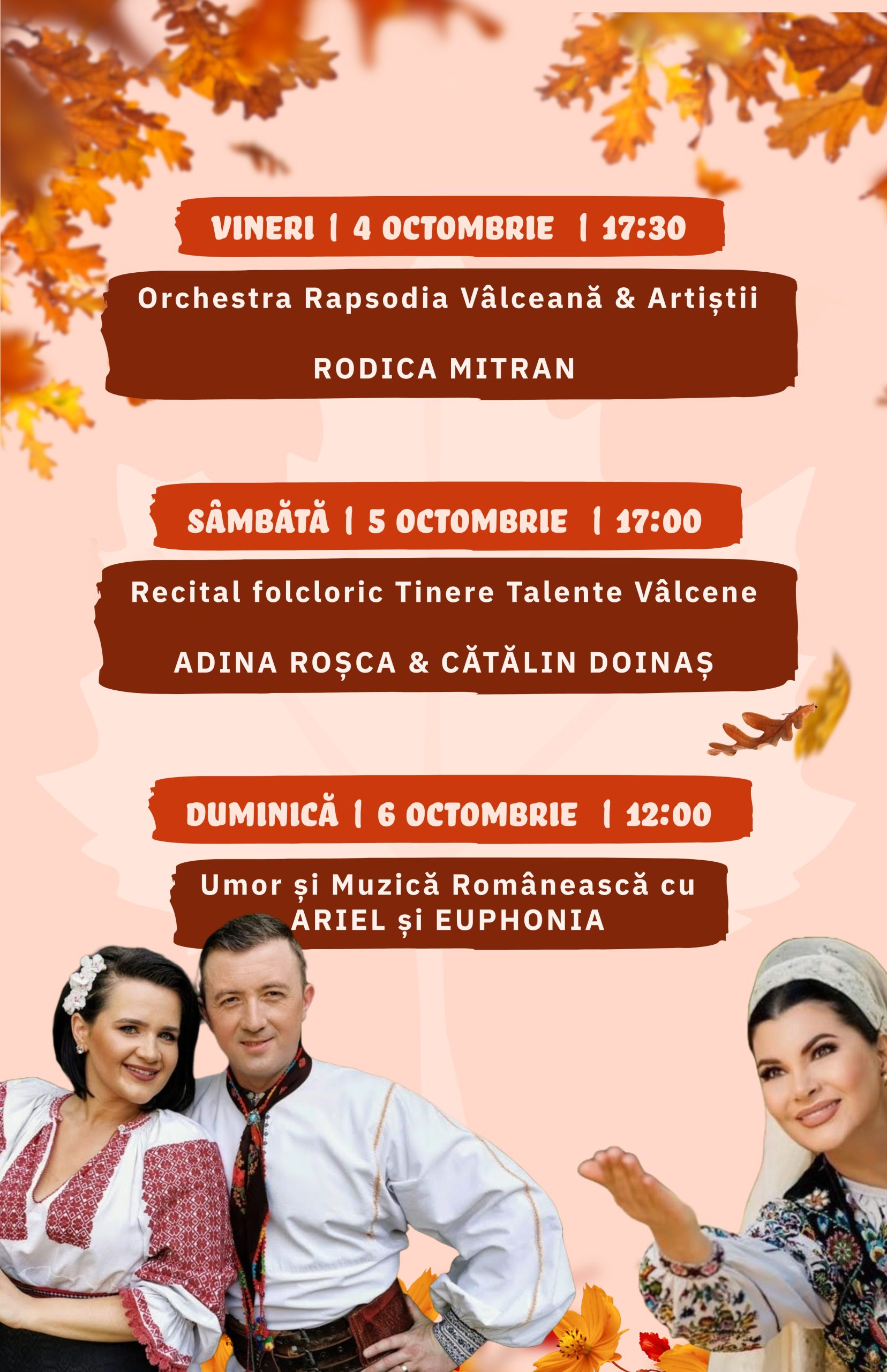 Ajuns la cea de-a 14-a ediție, evenimentul Zilele Recoltei se va desfășura în Scuarul Mircea cel Bătrân în perioada 4 – 6 octombrie, aproape 40 de producători din cinci județe (Sibiu, Argeș, Olt, Dolj și Vâlcea), precum și numeroși meșteri populari locali anunțându-și deja prezența. Roadele toamnei vor fi reprezentate de produse agricole (fructe și legume), produse tradiționale din carne, din lapte sau apicole, murături, must etc., iar vizitatorii târgului vor avea la dispoziție și două puncte de alimentație publică cu produse specifice. Nu vor lipsi spectacolele, protagoniștii acestora fiind artiștii instrumentali și vocali ai ansamblului „Rapsodia Vâlceană” alături de Rodica Mitran (vineri, 4 octombrie, de la ora 17.30), tinerele talente vâlcene împreună cu Adina Roșca și Cătălin Doinaș (sâmbătă, 5 octombrie, de la ora 17.00) sau Teatrul Municipal „Ariel” și corul „Euphonia” al Filarmonicii „Ion Dumitrescu” cu un spectacol de umor și muzică românească (duminică, 6 octombrie, de la ora 12.00).