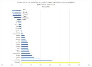 Analizând prețurile energiei electrice cu toate taxele incluse în țările din UE, la consumatorul casnic în luna iulie 2025 constatăm că România ocupă locul 1 în rândul țărilor din Europa, raportat la puterea de cumpărare și are cea mai mare creștere a prețului energiei electrice din întreaga Europă între lunile iunie – iulie 2025, fiind mai mult decât dublă decât următoarea cea mai mare creștere de preț din Europa (România ocupă în luna iulie 2025, locul 10 la prețul energiei electrice pentru populație neraportat la puterea de cumpărare).